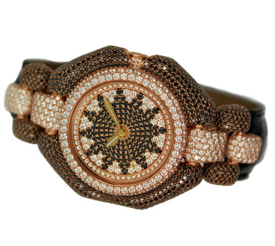 18-carat red gold 44 mm timepiece equipped with an ETA 2892A2 automatic movement. Hours and minutes in the centre. 1,990 diamonds totalling 21.48 carats – 1.252 black diamonds (diameter between 1.9 and 0.9 mm) and 735 Top Wesselton white diamonds (diam-eter between 2.15 and 0.9 mm); two-year guarantee.