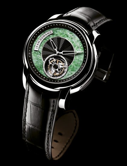 Platinum 950 (45 mm) one-of-a-kind timepiece equipped with an Io 200 manually wound rotating movement with off-centre flying tourbillon, exclusive watchmaking ball-bearing system with triple rotation within one block, moon phase display, vertical winding and setting through the centre of the movement from the case back, centre dial in blackened gold with fir-tree pattern and outer ring in Burma Jade. 130 hour power reserve indicator in the case band, four domed sapphire crystals and water-resistant to 30 metres.
