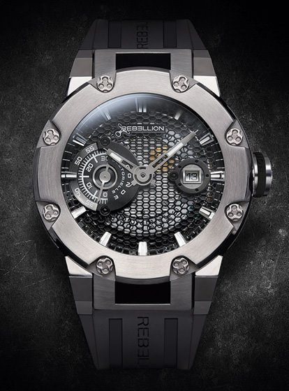 48 mm steel timepiece equipped with a RE-1 automatic movement with 50-hour power reserve. Modular case construction; hours and minutes in the centre; date at 3 o’clock; sectorial seconds at 9 o’clock; black DLC honeycomb dial; black rubber strap; patented deployment buckle; water resistant to 50 metres; special limited edition – Chronograph 24 Hours - of 24 pieces available that was worn by the pilots during the Le Mans 24 Hours in 2010.