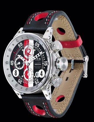 Titanium and black PVD 44 mm chronograph fitted with an automatic ETA Valjoux 7753 movement with a 46-hour power reserve. Hours, minutes and seconds; date at 4 o’clock, honeycomb dial, super light white hands, extra hard black PVD bezel, sapphire crystals front and back, double stitched racing material strap with three holes; water resistant to 100 metres; three-year guarantee.
