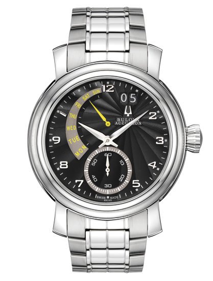 Stainless steel timepiece fitted with Bulova’s Accutron quartz movement. Hours, minutes and seconds, retrograde day hand in an arc between 8 o’clock and 12 o’clock with yellow days and hand; black sunray patterned dial; big date at 1 o’clock; curved anti-reflective sapphire crystal; screw-caseback; locking deployment buckle; also available with silver-white dial and black leather strap or two-tone bracelet; water resistant to 50 metres.
