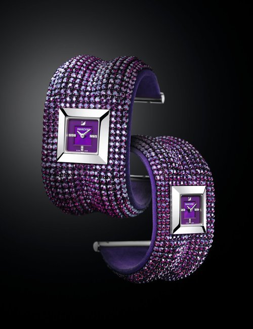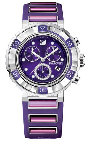 Swarovski presents its new Octea Chrono Purple for BaselWorld. This highly sporty timepiece is fitted with an ETA chronograph movement and comes in a stainless steel 40mm case. A unidirectional turning bezel is crafted out of transparent crystal and is integrated into the case. A purple dial; luminescent indexes; three sub dials indicating the minutes, seconds and tenths of a second; date display; choice of a purple rubber strap with six coloured crystals or an alligator strap complete this new edition.