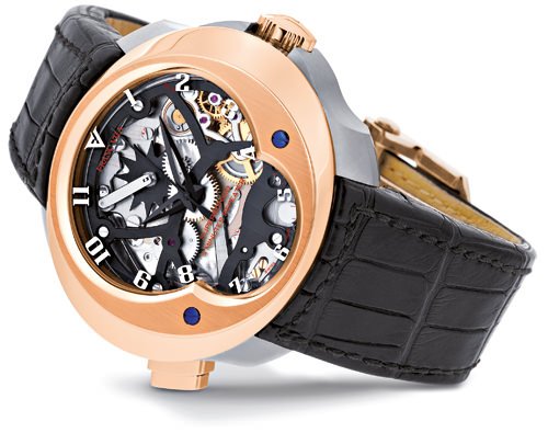 This five-minute repeater watch, one of its creator’s favourite complications, features a case combining titanium and red gold. To sublimate its sound, the movement bridges are made from Lightnium, an aluminium and lithium alloy used in aeronautical engineering. In order to optimise the exploration of its mechanism, this timepiece has no dial and thus reveals the rich beauty of the movement when the minute repeater is activated by the dedicated pusher on the case. 88-piece limited edition.