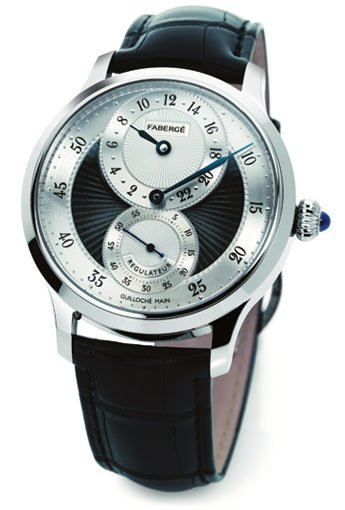 18-carat white gold case; silver guilloché enamel dial, hand enamelled; blue sapphire cabochon crown; sapphire glass domed on inside and outside; mechanical movement with hand winding. 38 Hour power reserve; water resistant 5 ATM. Diameter 40mm; height 11mm; 17 jewels; vibrations 21.600/h; strap width 20/18mm.