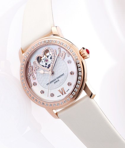 Rose gold plated automatic timepiece set with 48 full-cut diamonds (0.74 carats) on the bezel. 38-hour power reserve, convex sapphire crystal, screw-down see-through case back, opaline dial with mother-of-pearl decoration, guilloché decoration in the centre, ‘Amour’ aperture at 12 o’clock set with 37 full-cut diamonds (0.15 carats), satin strap and water resistant to 60 metres. Limited edition of 888 pieces.