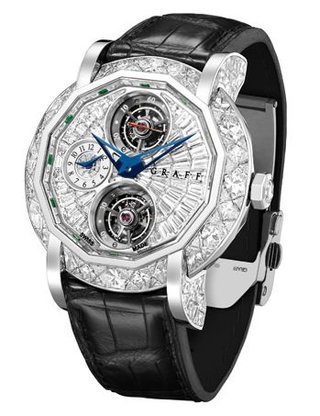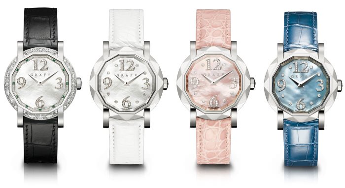 Continuing the signature Graff design of a facetted bezel reminiscent of the cut of a brilliant diamond, this variation on the classic GraffStar features diamond studded numerals and a mother-of-pearl face in a variety of luminous colours. Available in white, black, pink and blue mother-of-pearl, the dial of each watch is set with 43 brilliant-cut diamonds on a matching coloured leather strap with 12 diamonds on the buckle, diamond tipped crown and facetted transparent sapphire crystal case. This elegant new style is also available with a bezel featuring a unique mosaic of 113 ‘trilliant’-cut diamonds and 11 baguette emeralds.