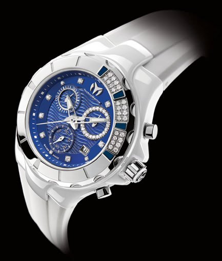 A return to basics for Technomarine in a re-introduction of the brand’s aesthetic features and nautical characteristics with the Cruise Ceramic Chroma. This rather brash chronograph displays a mix of ceramic, silicone and diamonds. Once again, any suspicion of banality is defied by the blue, green or pure-red dial, a trio of colours that underscores the contrast between the immaculate white of the case and the strap.