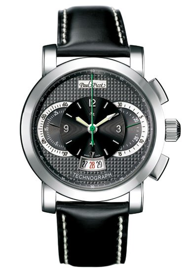 The automatic chronograph mechanism of the Technograph, developed from the base calibre Valjoux 7750, sits in a case with a generous design. The sophisticated dual dial system enables hours and minutes to be displayed in the middle of the watch (on the top dial). The real-time seconds and minutes of the chronometer function are displayed on two crescent-shaped oversized counters on the lower dial, in a circular motion in fact. The originality of the dial is completed with a patented display system for the date in a window in which the date of the current day is displayed in red and the date of the previous or next day is displayed in grey.
