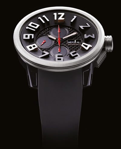 Oversized round case and a 3D tone-on-tone dial, with perfectly designed raised hour-markers, gives the timepiece a bold, modern, unconventional look. The case is in titanium and polycarbonate, two elements valued for their lightness and resistance. The silicone strap is the ultimate signature of this avant-garde watch. Available in a chronograph version with a Valjoux movement or a three-hand version. Both are limited to 50 pieces.