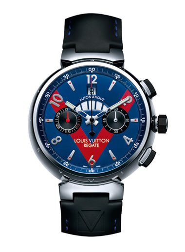 The Louis Vuitton Tambour Automatic Regatta Navy chronograph is equipped with the LV171 calibre (from Dubois Dépraz) offering water sports enthusiasts countdown and fly-back functions, both of which are indispensable for measuring boating performance. The intense blue of the dial is marked with a red ‘V’, Vuitton’s traditional symbol, which is also discreetly featured on the strap. This limited edition of 250 watches will be available in Louis Vuitton stores as of November 2010.