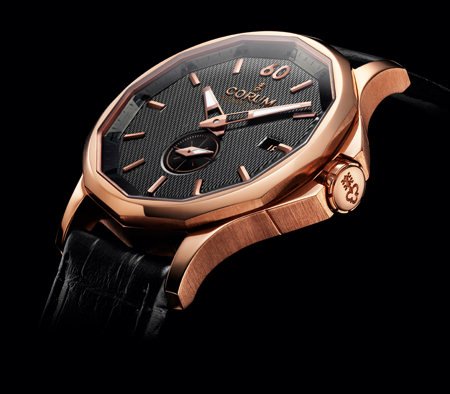 The Corum Admiral’s Cup Legend 42 is an elegant version of the iconic and very sporting Admiral’s Cup. The signature 12-sided 42mm case is in 18-carat 52N red gold and features a charcoal-grey dial with a Barleycorn finish. The automatic movement (CO395) features hours, minutes, small seconds and date. The timepiece comes on a black crocodile leather strap and is water-resistant to 50 metres.