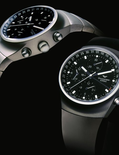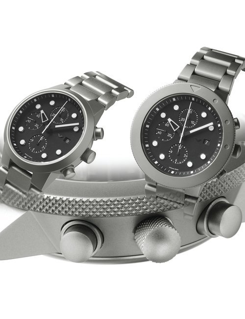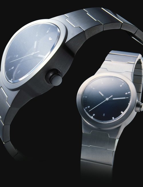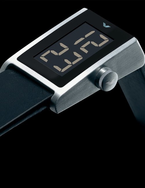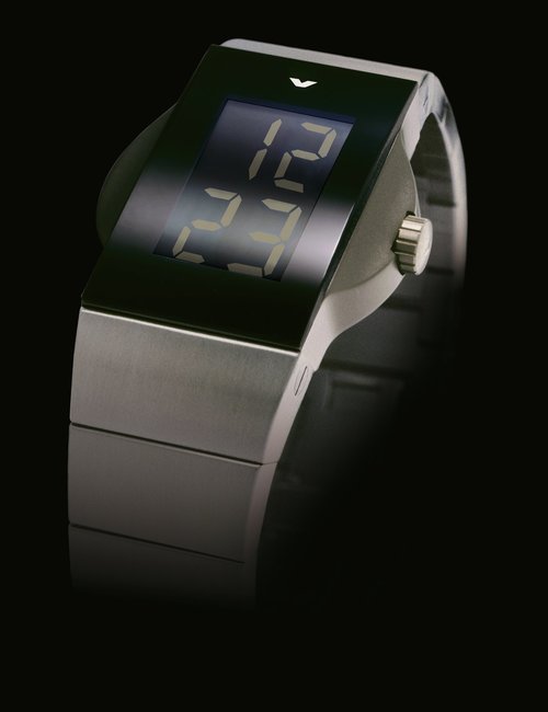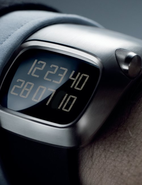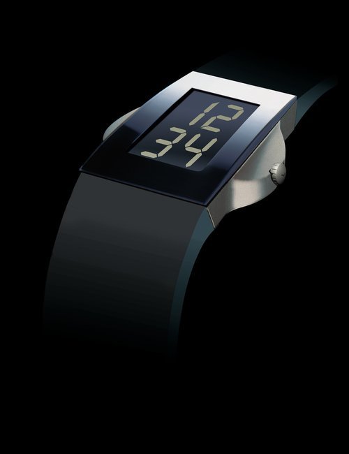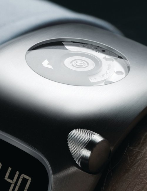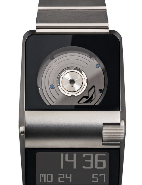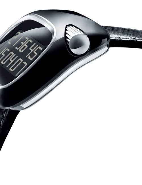 Movement: Automatic, barrel-powered micro-generator, 45-day power reserve, tungsten rotor. Functions: EasySkroll® operating system with the following indicators: T1/Date, T2/Date 2, T1 and T2 Alarm, perpetual calendar, chronograph, countdown, choice of display - 12 or 24 hours and 3 date formats. Case: Scratch-proof Durinox® hardened stainless steel, or black PVD-treated, 56.3 x 38 mm. Upper part with rotor and micro-generator; lower part with digital display Sapphire crystal. Water-resistant to 30 m /3 ATM. Dial: LCD screen, LED backlighting. Bracelet/Strap: Rubber, or Durinox® steel (black PVD-treated or not), with safety folding clasp.