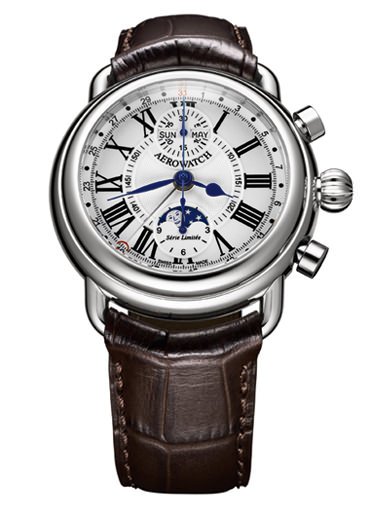 This limited edition of 500 pieces features the 1942 case with a transparent case-back that reveals the self-winding Valjoux 7751 chronograph movement. In addition to the chronograph function with central seconds and totalisers at 6 o’clock and 12 o’clock, the 1942 Chronograph also has a full date display with day and month at 12 o’clock and the date displayed by a second central hand. Stainless-steel case, 42mm diameter, sapphire crystal, silvered dial and brown leather strap. Water resistant to 50 metres.