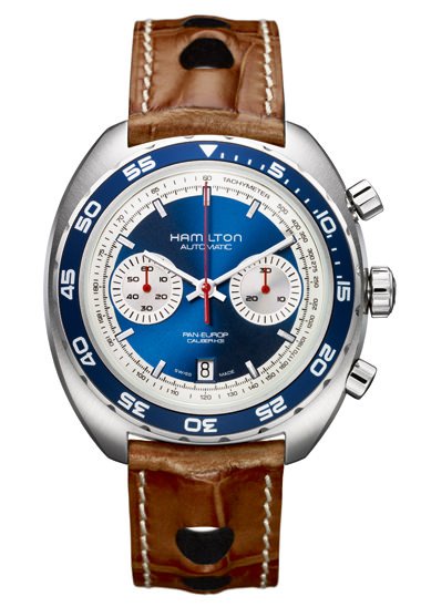 A re-edition of a 1971 model, the Pan Europ has been improved over the original with a new movement, the H31, which is based on the Valjoux 7753 and improved with a mirror-polished balance spring, a larger barrel (60-hour power reserve instead of 42 hours) and a personalised balance bridge decorated with an interconnected “H“ motif. Stainless-steel case, 45mm diameter, sapphire crystal blue dial and brown leather strap. Water resistant to 100 metres.