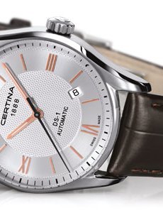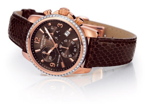 The jewellery version of Certina’s Double Security (DS) model has a rose-gold PVD coating on a stainless-steel case and a bezel set with 60 Top Wesselton diamonds (0.465 ct) to mark the passing hours. It has a brown sunray dial and matching snakeskin-finish brown leather strap. The chronograph is powered by the ETA 251.471 quartz calibre and displays elapsed time to within 1/10th of a second. Also available in stainless steel with a white mother-of-pearl dial and a choice of stainless-steel bracelet or white leather strap.