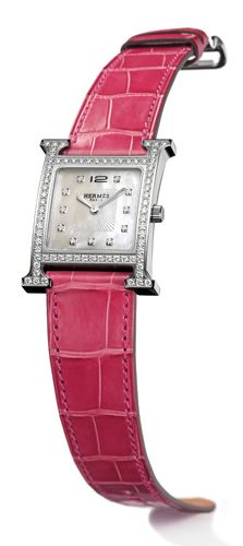 A light grey varnished motif in the centre evokes a pale wintry sun, while 11 diamond hour-markers light up the dial and the 12 o’clock twin Arabic numerals highlight the mystery of midnight. The 26 mm steel case is set with 72 diamonds accentuating the original shape of the watch: the famous H for Hermès. This model is fitted with a smooth raspberry alligator strap adding a warm, natural touch and creating a striking contrast with the immaculate white gleam of the case.