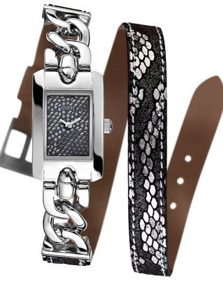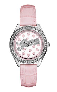 Stainless-steel case, 36.7mm diameter, quartz movement, bezel set with crystals, white dial with pink hearts and Guess logo in glitter, pink strap with crocodile imprint.