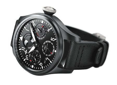 Ceramic case, 48mm diamater self-winding mechanical calibre 51614 with perpetual calendar function, 168-hour power reserve, sapphire crystal front and back, black dial, black fabric strap with shot-blasted steel folding clasp. Water resistant to 60 metres.