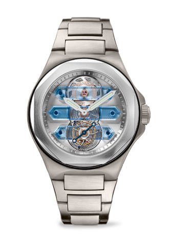 Brushed titanium case, 42.6 mm diameter, Girard-Perregaux 9600-0004 self-winding movement, 48-hour power reserve, sapphire crystal front and back, titanium bracelet with contrasting horizontally and vertically brushed links, titanium folding clasp.