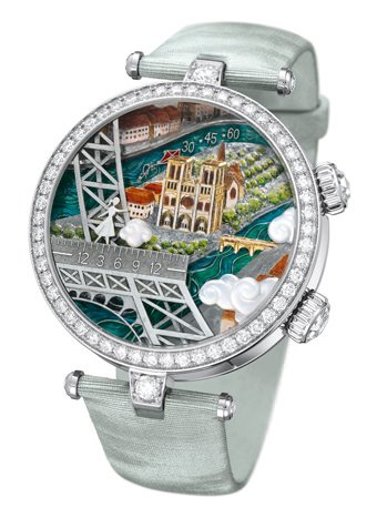 The Lady Arpels Poetic Wish continues the tradition, started by Van Cleef & Arpels with the Poetic Wish collection in 2006, of using a watch to tell a story as well as the time. This model is one half of a pair for 2012 that feature the story of two young lovers in Paris.
