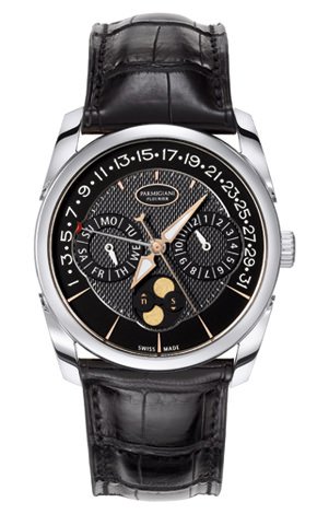 18-carat white-gold case, 40 mm diameter, PF 339 self-winding movement with retrograde annual calendar and precision moon phase indication, black dial with “barley grain” pattern, sapphire crystal front and back, Hermès alligator leather strap with 18-carat white-gold buckle. Water resistant to 30 metres.