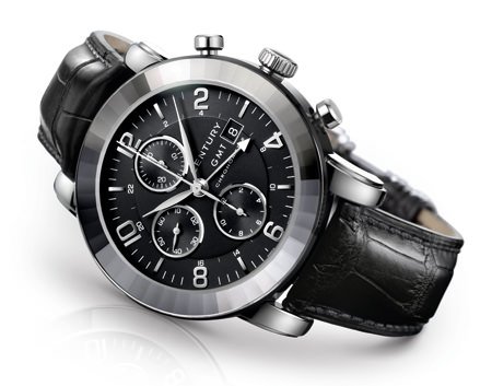 Century is famous for its use of faceted sapphire crystal, which is used in this gent’s model on the bezel, which consists of 48 hand-cut and polished facets in a shade of palladium that marries well with the mirror-polished finish of the black dial.
