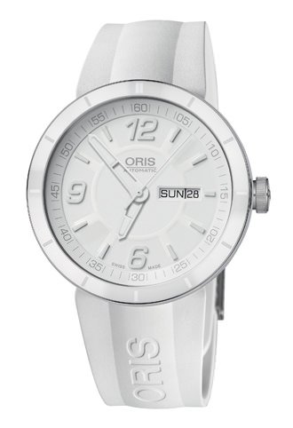 Stainless-steel case, 43 mm diameter, white ceramic bezel, Selitta SW220 self-winding mechanical movement with red Oris oscillating mass, 38-hour power reserve, white rubber strap with easy-adjustment mechanism and folding clasp. Water resistant to 100 metres.