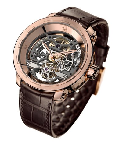 The absence of a dial and the skeleton work on DeWitt’s new model are designed to show off the brand’s DW8028 calibre – DeWitt’s first 100 per cent manufacture movement. Round 43mm case in 18-carat rose or white gold, DeWitt calibre DW8028 manually-wound movement, 18,000 vibrations per hour, 72-hour power reserve, chocolate-brown or matt black alligator leather strap with 18-carat white or rose gold pin buckle.