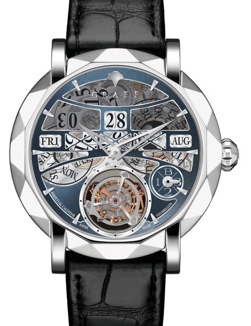 Amongst 306 diamonds totalling a staggering 30.61 carats set all over the 48mm case and dial on the MasterGraff Double Tourbillon GMT nestle two tourbillon carriages with their own seconds scales, as well as a second time zone display at 9 o’clock. The watch has a 72-hour power reserve and is fitted with a black leather strap with gold buckle. Limited edition of 10 pieces in pink or white gold.