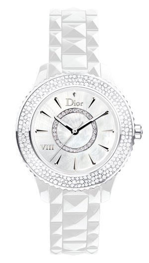 Despite its small case size, this Dior VIII model glistens with a total of 203 VVS diamonds for approximately 0.82 carats. White ceramic case, 28mm diameter, with snow-set diamond bezel, quartz calibre, white mother-of-pearl dial, central ring set with diamonds, white ceramic bracelet with steel folding clasp.