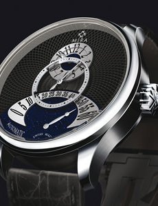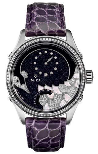 The dial of Mira’s first ladies’ collection features a sumptuously decorated swan set with 84 diamonds (0.26 carat). A further 80 diamonds (1 carat) adorn the case, the lugs of which are set with four topazes and the crown with a solitaire. Round 43mm stainless-steel case, self-winding movement, orange or violet alligator leather strap with folding clasp set with a solitaire.