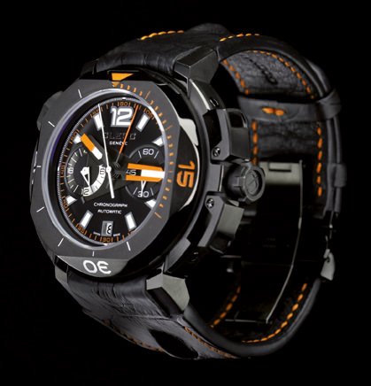 The original chronograph display on this limited edition shows the hours and minutes using two central hands, with counters at 3 o’clock for small seconds and 9 o’clock for day/night indication over 24 hours. Round 43.8mm stainless-steel case with black DLC coating, exclusive self-winding CO608 calibre, 28,800 vibrations per hour, 44-hour power reserve, black dial with luminous hour markers and hands, black “Hornback” crocodile strap with steel or black DLC folding clasp. Limited edition of 500 pieces.