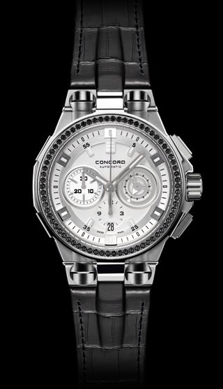 This is one of a pair of black and white models, representing the yin and yang, whose bezels are set with the corresponding colour of diamond, are served up by Concord for BaselWorld this year. Round 43mm stainless-steel case, self-winding mechanical movement, 28,800 vibrations per hour, matching black or white alligator leather strap.