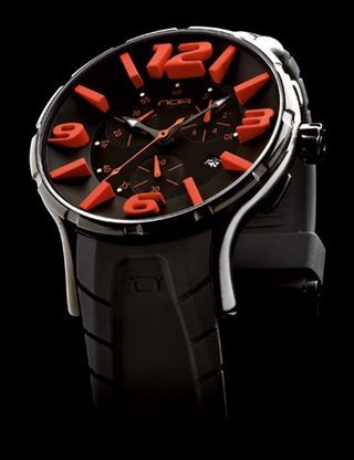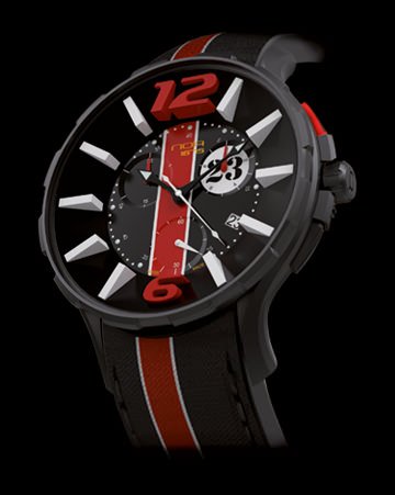 The GRT 001 Le Mans marks the beginning of a series of five limited editions by NOA that are dedicated to some of the world’s most famous motor racing circuits. The last two digits of the year in which the first race was held at the circuit are placed in the 2 o’clock position. Round 44mm diameter black PVD-coated titanium case, ETA 251.272 quartz chronograph calibre, vulcanised rubber strap with folding clasp in black PVD-coated steel. Limited edition of 200 pieces.