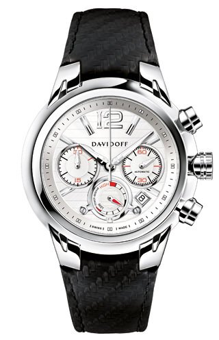 With the Velero Davidoff offers a classic chronograph design that can be worn on any occasion with a no-fuss polished case and a simple and clearly legible dial. Round 45mm diameter stainless-steel case, ETA 2892-2 self-winding chronograph calibre, 42-hour power reserve, black caflskin strap with carbon fibre pattern.