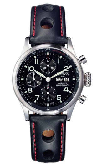 This motorsport-inspired chronograph is a limited edition of 333 pieces that comes in a wooden box with an Alfa Romeo Tipo 33/3 model car. Round 42mm diameter stainless-steel case, Valjoux 7750 self-winding chronograph movement, black calfskin strap with holes, red contrast stitching, pushbutton folding clasp.