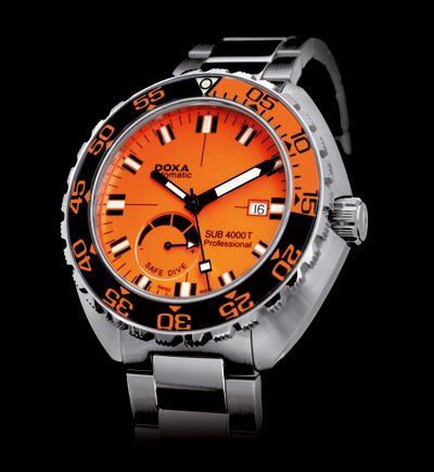 This new Professional model in the SUB 4000T collection has a unidirectional rotating bezel and indicates compression stops in feet for divers. Round stainless-steel case, 46mm diameter, self-winding mechanical movement with 42-hour power reserve, helium valve at 9 o’clock, power reserve indication at 7 o’clock, stainless-steel bracelet with extension for wearing over a diving suit. Limited edition of 200 pieces.