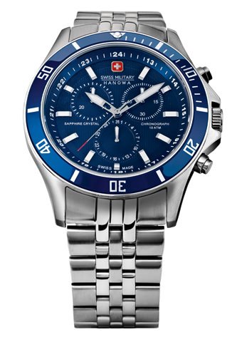 This new chronograph version enhances the classic Flagship collection from Swiss Military Hanowa. Round 42mm stainless-steel case, ISA 8171/202 quartz calibre, blue, white or black dial with luminescent hands and hour markers, blue, white or black leather strap or stainless-steel bracelet.