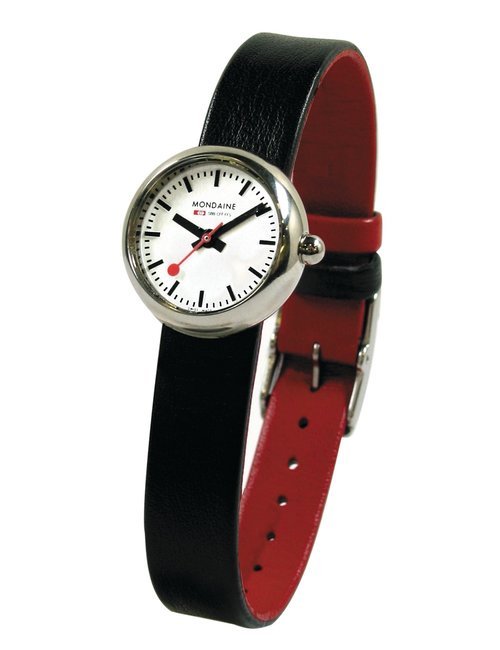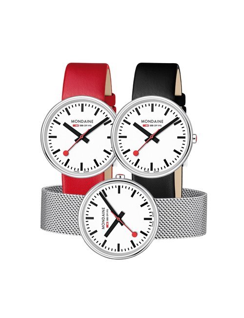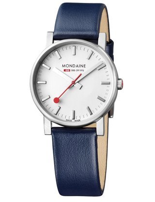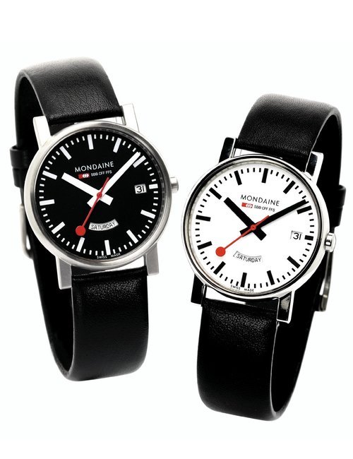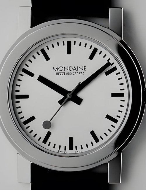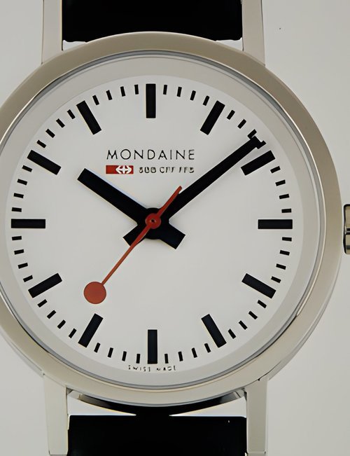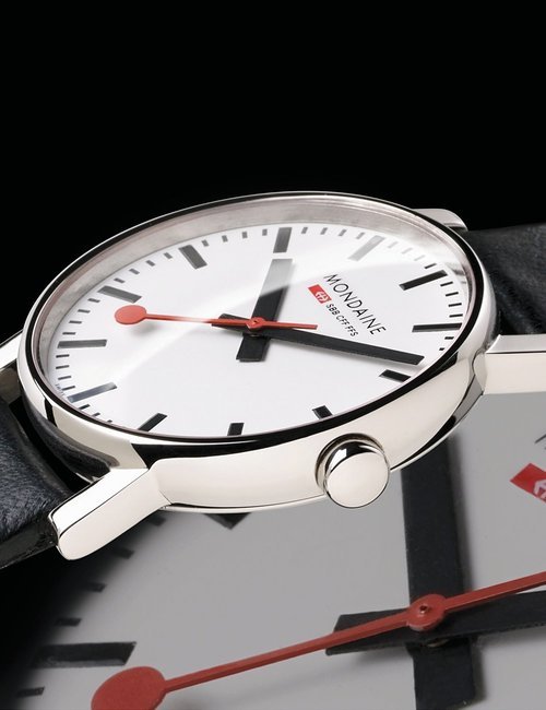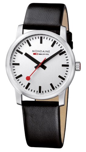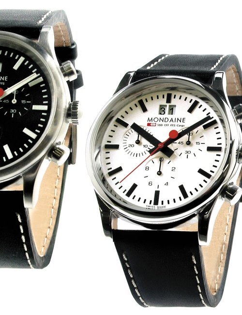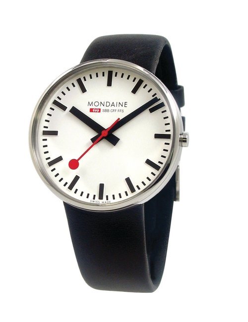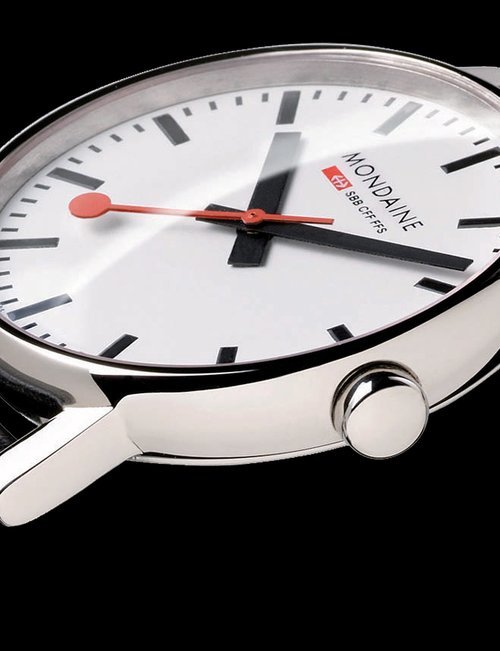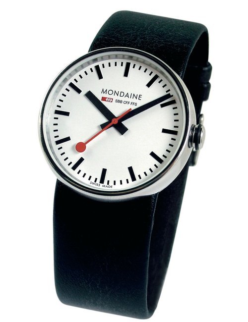 An already classic design is taken to the next level with this new vintage version of the watch derived from the legendary station clock of the Swiss railways. Round 41mm brushed stainless-steel case, ETA 2801-2 self-winding calibre, silver-toned, vertically brushed white dial with raised hour markers, black leather strap with stainless-steel buckle.