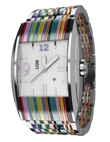 An explosion of colours surrounds the distinctive case of the Purestyle Tutti Colors watch. Rectangular curved case, 45 x 35mm, in Alumod and stainless steel, ETA 2678 self-winding movement, 28,800 vibrations per hour, 38-hour power reserve, solid bracelet in Alumod/stainless steel with different-sized links, coloured to match the case.