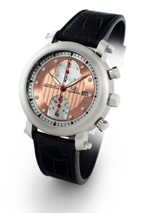 Hours, minutes, date, centre seconds chronograph, 30-minute counter at 12 o’clock and 12-hour counter at 6 o’clock. Case in brushed and polished stainless steel, 44mm diameter, sapphire crystal, bronze finish dial with central Côtes de Genève decoration, mother-of-pearl subdials, luminescent hands and hour markers. Valjoux 7750-based self-winding chronograph movement modified for vertical counter display, engraved and personalized bridges with Côtes de Genève decoration.