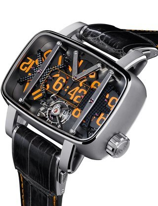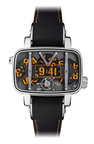 The first watch presented by 4N is a limited edition of 16 pieces available in 18-carat white gold or platinum. The unique patented movement has been developed in conjunction with Audemars Piguet Renaud & Papi (APRP) and uses four jumping discs to display the hours, five to display the minutes and one for the ten minutes using large 5.5mm numbers. The movement comprises 520 components and 87 rubies and has twin barrels that ensure a power reserve of 237 hours (10 days).