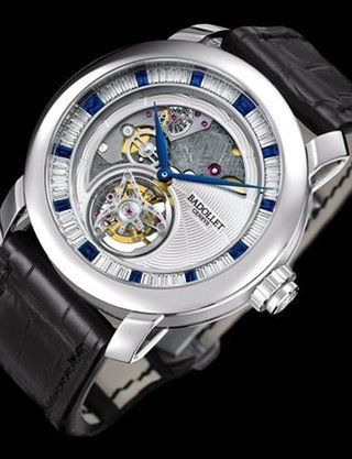 This intriguingly named piece (“Ivresse” in French means drunkenness) was designed by Eric Giroud and hides a flying tourbillon in the domed, manually-wound Badollet Calibre 2012 movement with a conical going train and a 120-hour power reserve. Case in 950 platinum, 53.80mm x 30mm, dark blue satin-brushed dial, sapphire crystal front and back, midnight blue alligator leather strap with 950 platinum pin buckle.