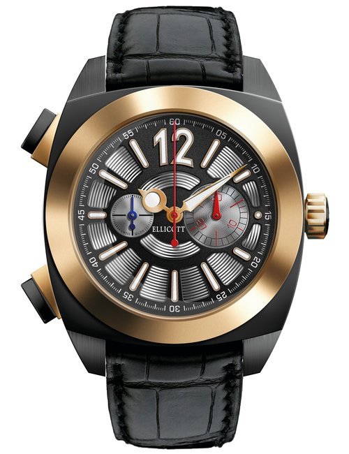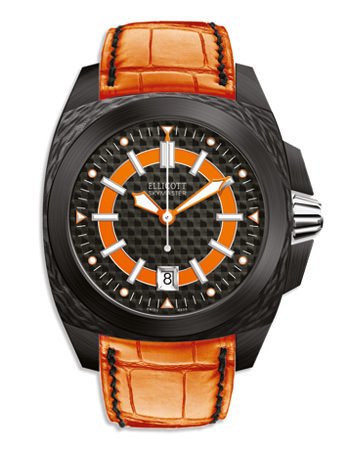 Ellicott transfers the colours theme, which is more frequently found on fashion watches, to a sports watch in the SkyMaster line of its Mach One collection, with colours ranging from white, pink and red to orange, combined with carbon fibre dials. Tripartite case in monolithic carbon epoxy and black steel DLC, 54mm x 44mm, luminescent hour markers and hands, sapphire crystal front and back, matte orange alligator strap with contrasting black stitching.