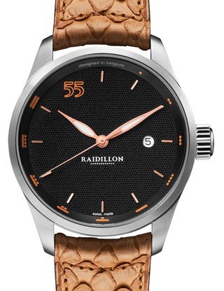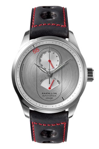 This model by Belgian brand Raidillon (named after a corner on the famous Spa-Francorchamps circuit) has a silvered dial with galvanic effect, 55 in red, a 24-hour hand on a sub-dial at 12 o’clock and a fan-shaped power reserve indicator at 6 o’clock. It is powered by an ETA 2892/2 calibre with a Soprod 9035 module. Limited edition of 55 pieces with a 42mm diameter stainless-steel case, sapphire crystal front and back.