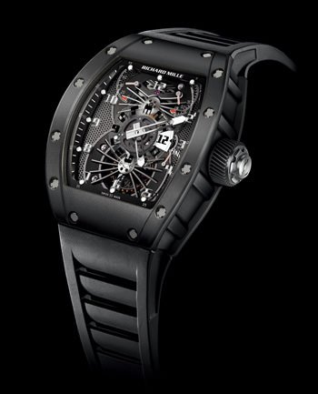 Only five of this limited edition of the RM 022 tourbillon “Aerodyne” Dual Time Zone will be produced. It has a lightweight case made from carbon nanotubes. Inside the 50mm x 40mm case the movement uses a carbon nanofibre baseplate and a new alloy called orthorhombic titanium alumnide. Its motor is the Calibre RM022 manual winding tourbillon movement with a power reserve indicator (70 hours) between 11 and 12 o’clock and a torque indicator that shows the mainspring’s internal tension.