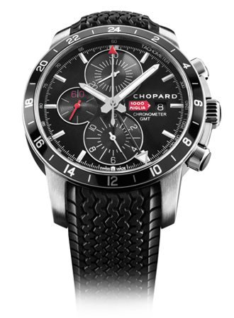 Available as a limited edition of 2,012 pieces in stainless steel or 250 pieces in red gold, Chopard’s 2012 edition of the Mille Miglia watch is a 42.4mm diameter COSC-certified self-winding chronometer with chrongraph and GMT functions. It features the Mille Miglia arrow logo on the crown and case back and a black dial with sapphire crystal. The strap in natural black rubber has the tyre-tread design of a 1960s Dunlop racing tyre.