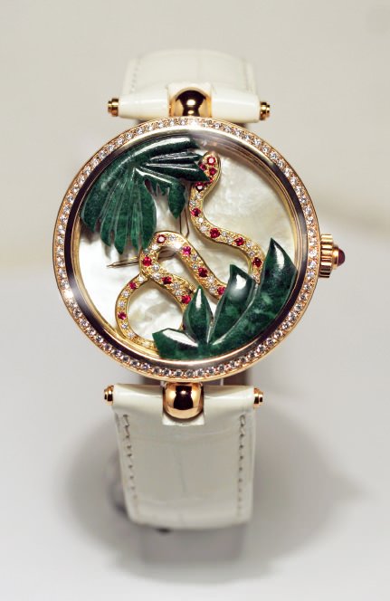 Two-body 18 Kt. rose gold case pavé set with 1.500 ct TW VVS diamonds, solid mother of pearl dial. Rose gold hands. 7.00 mm crown with cabochon Ruby. The Poetic Interworld Object a rose gold snake set with diamonds, rubies and mille grains fixed abow the hands, under the protecting sapphire crystal. Over the sapphire crystal leafs cu from spinach green jade. Historical mand-winding movement FHF 96. Case diameter 42.10 mm, height 9.80 mm. Bespoke timepiece completely hand made in the atelier.