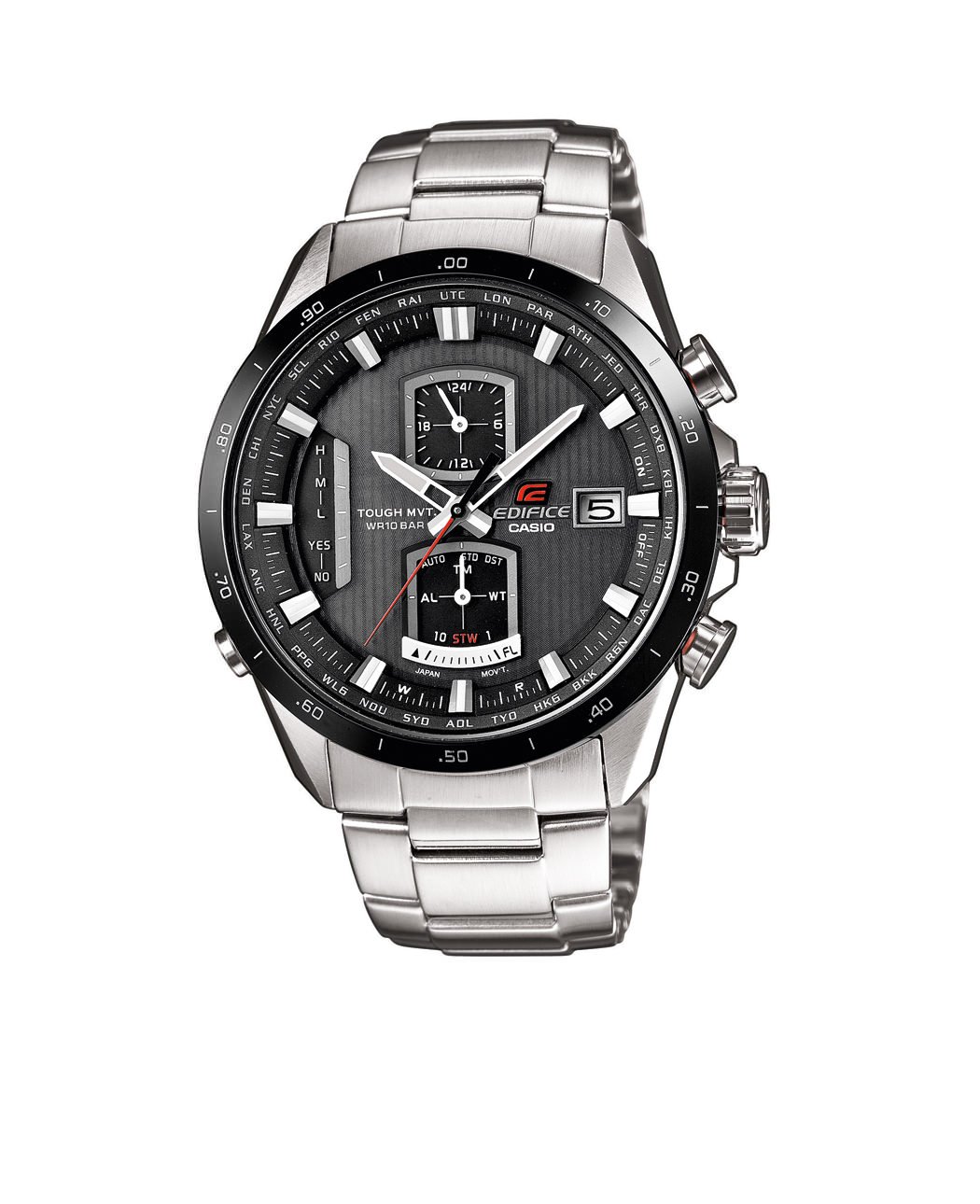 Movement: Solar-powered quartz analogue/digital with radio time signal reception, date, 1/20th second chronograph, world time, daily alarm