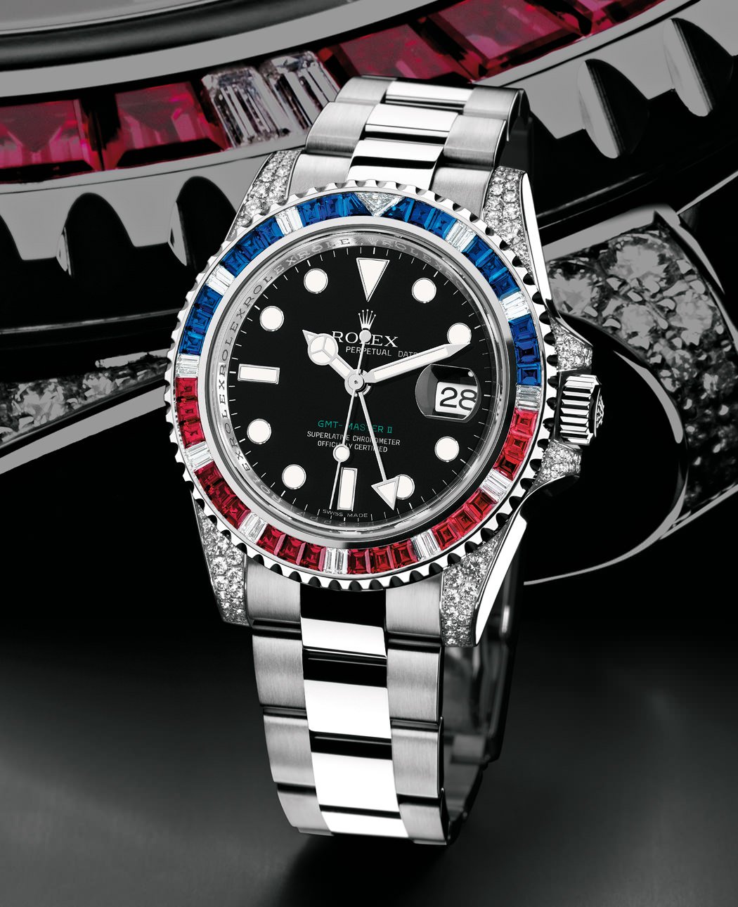 Case: 18 ct white gold case with 24-hour rotatable bezel set with diamond, sapphire and ruby baguettes. Case-lugs and protective shoulders to the crown set with brilliants.